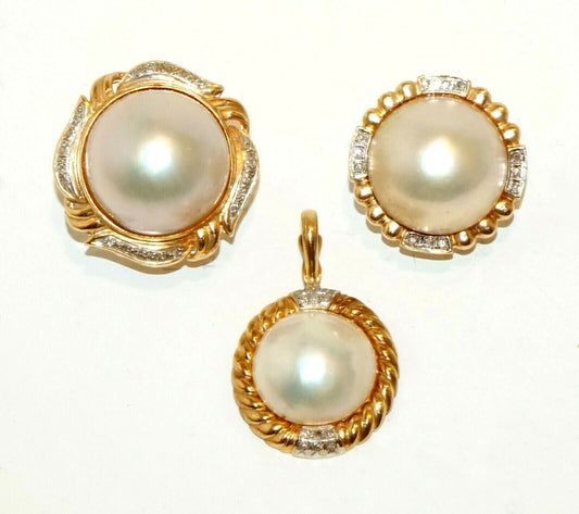 3Pc 14k Yellow Gold & Mabe Pearl & Diamond Earring Mixed Lot & Pendant (GoH)#11