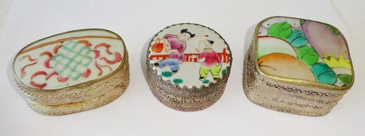 3x Chinese Silver & Enameled Pottery Shard Boxes w. Floral & Figure Motifs (Wok)
