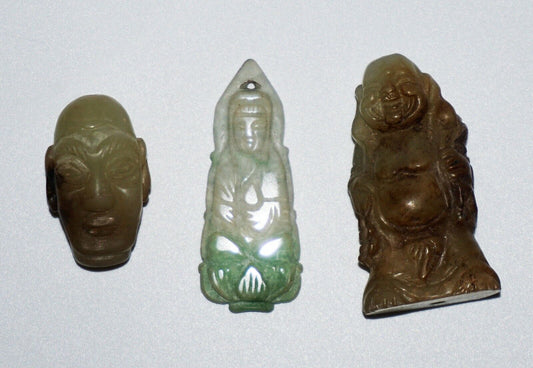 3x Chinese Hard-stone & Jade Carvings Buddha, Kwan Yin, Head Pendant (NoN)P26