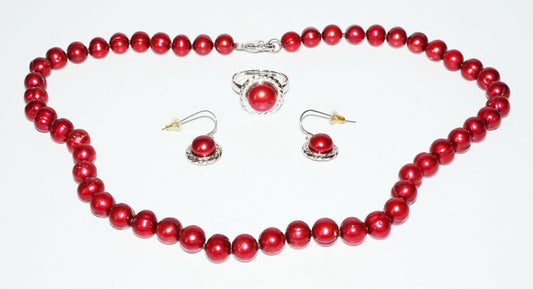 4Pc Sterling Silver & Red Pearl Necklace Ring Sz.8 & Pair Earrings Set (SaR)#441