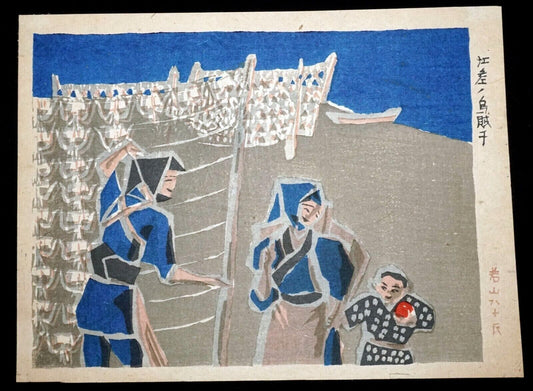40s Japanese Color Woodblock Print Squid Drying Yasoji Wakayama 1903-1983 (SeF)