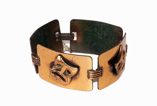 4Pc 50s US Genuine Copper Tragedy Mask Motif Bracelet, Ear Clips & Brooch (Hod)