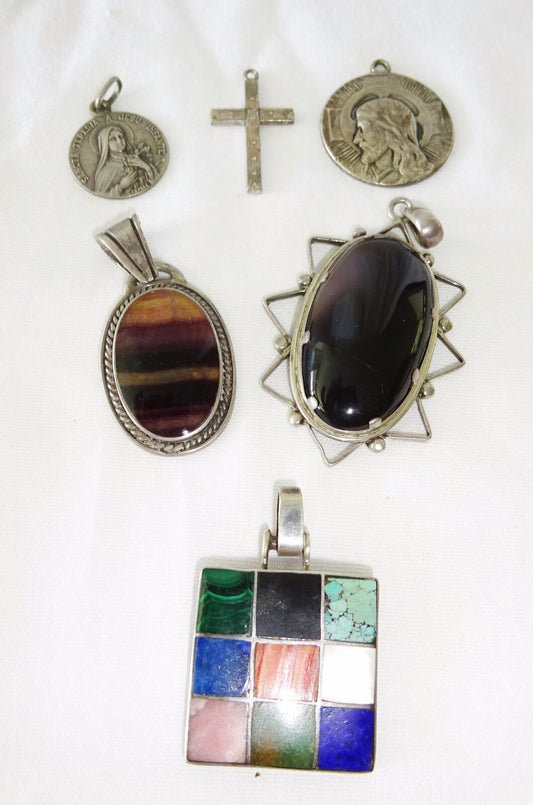 6xPc Sterling Silver Mixed Pendant Lot, Religious Medals, Cross, Gemstone (Mal)