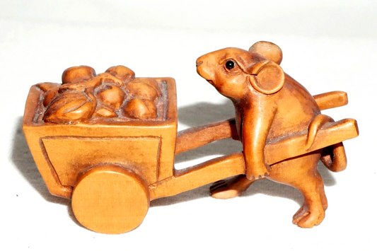 Vintage Japanese Carved Wooden Netsuke Mouse Pushing a Cart (FeH