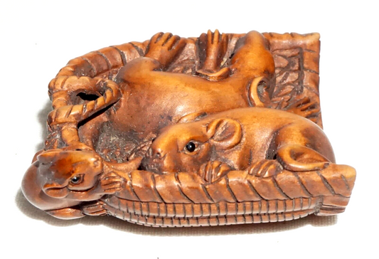 Vintage Japanese Carved Wooden Netsuke Three Mice in a Basket (FeH)