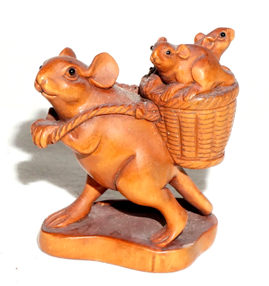 Vintage Japanese Carved Wooden Netsuke Mouse w. Basket & Babies (FeH