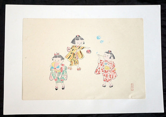 60s Japanese Woodblock Print Three Girls Blowing Bubbles Hitoshi Kiyohara (***)