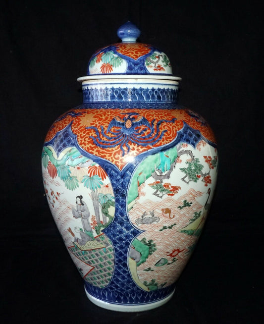 18C Japanese Edo Imari Covered Porcelain Baluster Jar Scholar Motifs & Box (FiS)