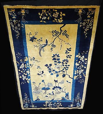 1920s Chinese Blue & Gold Wool Pile Rug w. Auspicious Motifs 92"x 60" (Sig)