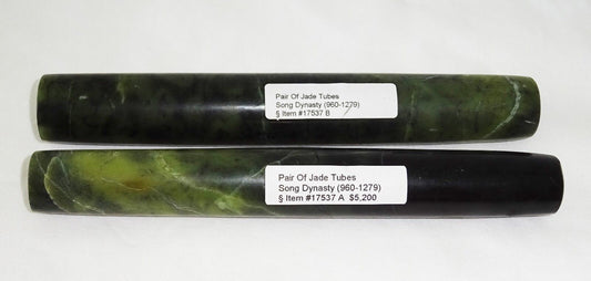 10C Pair Chinese Song Dynasty Large Green Tubular Drilled Jade Beads (Mil)