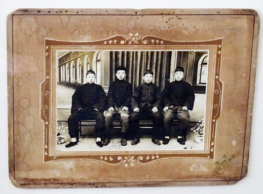 1900 Chinese Framed B&W Photo "Four Seated Young Men" by marked (Mil) #7800