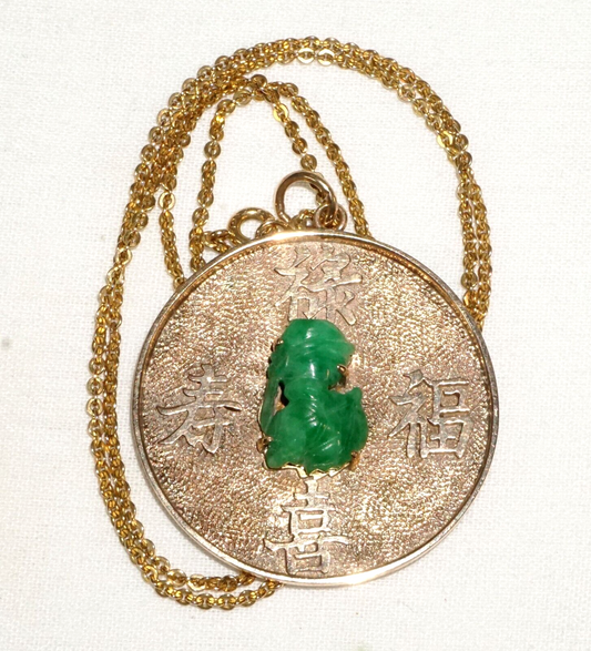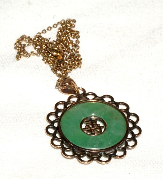 Vtg Chinese 14K Yellow Gold 24" Necklace w 14K Disc Pendant Jadeite Accent (TiG)