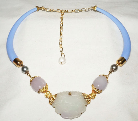 Vtg. Chinese Fashion Necklace White Jade Pendant & 2x Lavender Jade Cabs (LeP)