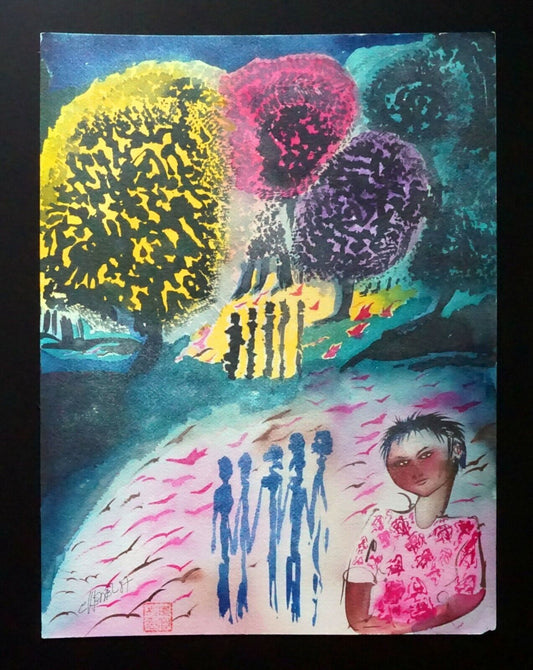 '80s France Hawaii Outsider Art WC Painting Chinese Girl Claude Vedel (EtJ)#39