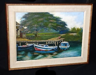 1930s Hawaii Koa Framed Oil Painting Boats on a Dock by Lloyd Sexton (Geo)