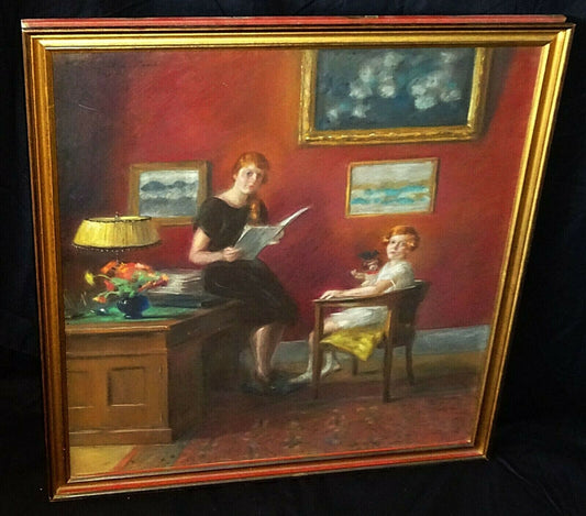 1925 US Pastel Painting Interior w. Mother & Daughter by illegibly signed (ScD)