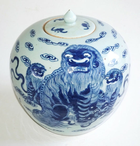 1900 Chinese Ginger Jar w. Blue & White Lion Dog & Stylized Cloud Motifs (AHB)