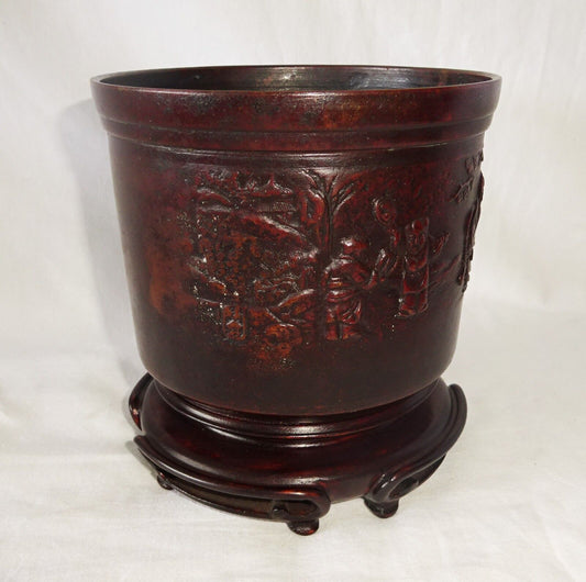 18/19C Chinese Bronze Scholar Motif Brush Pot w. Lingzhi Handle & Stand (808)