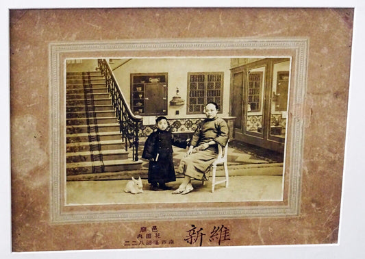 1900 Chinese Mounted B&W Photo "Mother & Boy Child & Bunny" by marked (Mil)