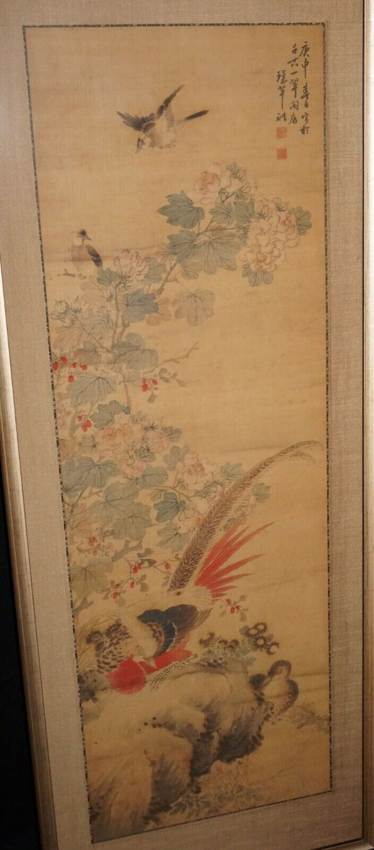 1800 Chinese Framed Painting Scroll Birds on Flowering Branch by Huan Chi (CWo)
