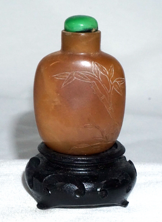 Vtg Chinese Agate Carved Snuff Bottle w. Floral & Bamboo Motifs & Stand (LLA) IC