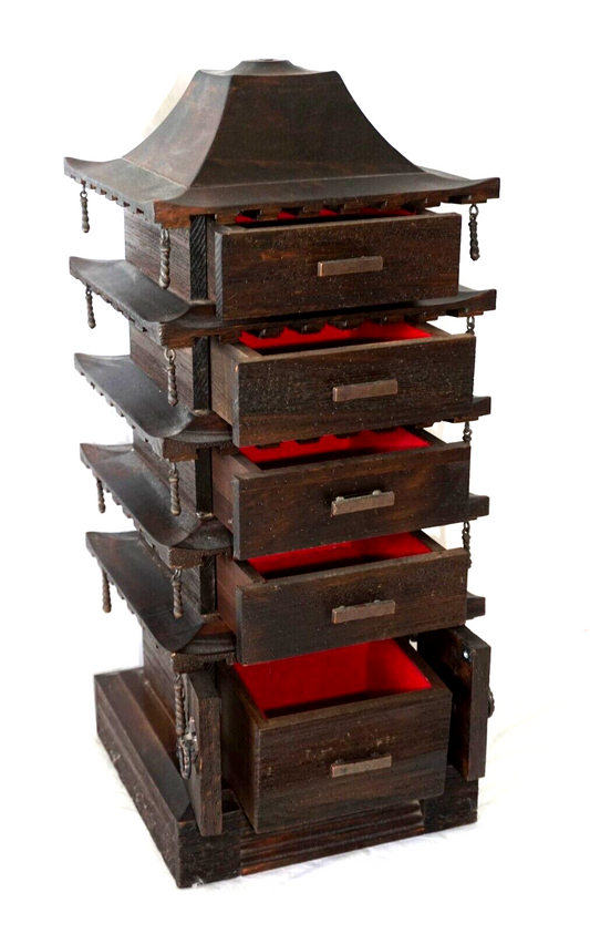 Vintage Japanese Wooden Pagoda Design Jewelry Multi Drawer Cabinet (HoJ)