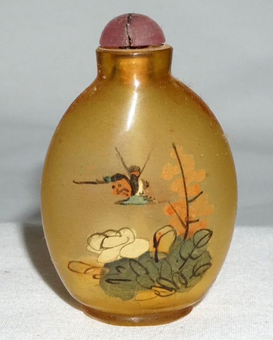 Vtg Chinese Reverse Painted Glass Snuff Bottle w Bird & Lotus Motifs (LLA) IC
