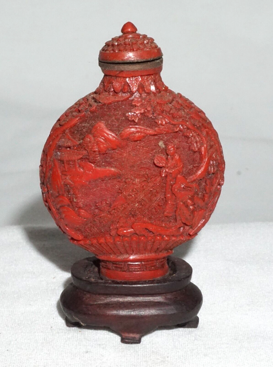 Vtg Chinese Cinnabar Style Snuff Bottle w Molded Figure Motif Reign (LLA) IC