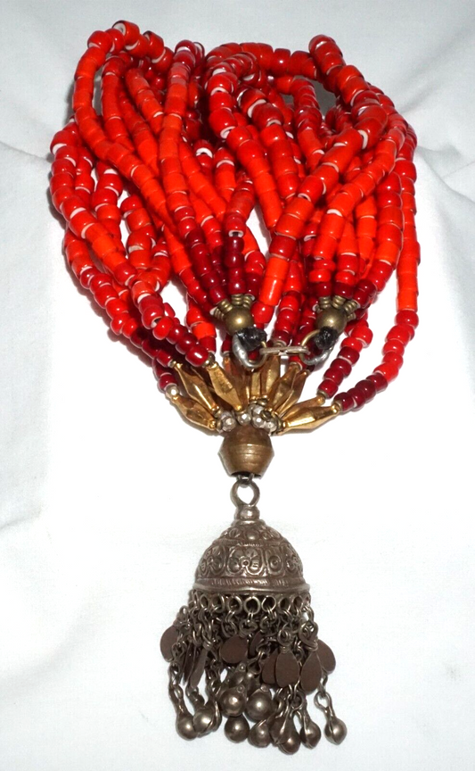 Vtg Chunky 7x Strand Red Glass Bead Necklace Bell Pendant Masha Archer (GeB)#16