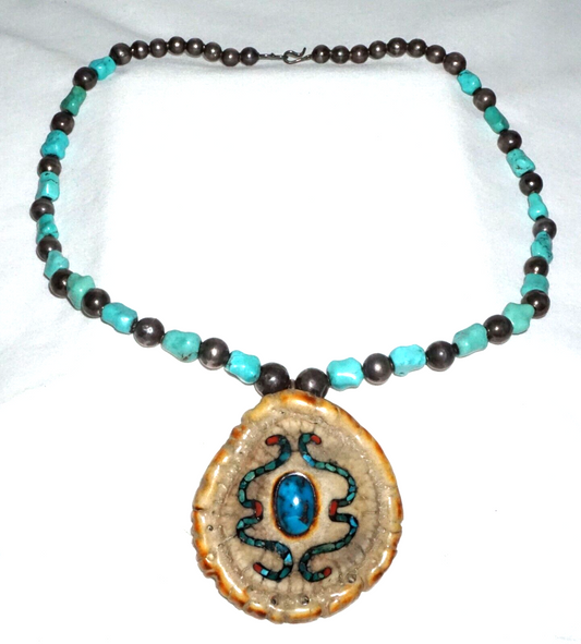 Vtg S.W. Silver & Turquoise Bead Necklace w. Inlaid Elk Antler Pendant (GeB)#16