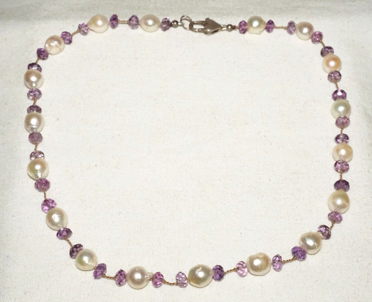 Vintage Sterling Silver Necklace w. Baroque Pearls & Facetted Amethyst (LeP)