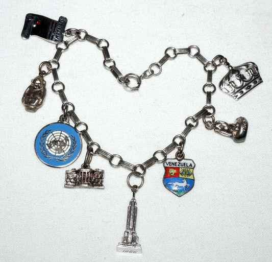 Vintage Sterling Silver & Enamel 8x World Travel Charms Bracelet (KoS) L11