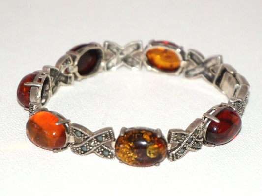 Vintage Sterling Silver & Marcasite X Motif Bracelet set w. 6x Amber Cabs(NoN)B9