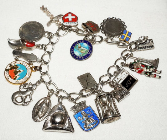 Vintage Sterling Silver 21x World Travel Charms Bracelet incl. Coins etc(KoS) L8