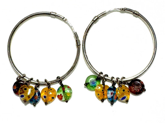Vintage Unmarked Silver Hoop Earrings w. Multicolor Glass Charm Accents (LoC)17