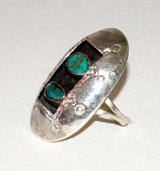 Vintage Oval Silver Ring Sz 7 set w. 2x Turquoise Cabochons unsigned (RgR)