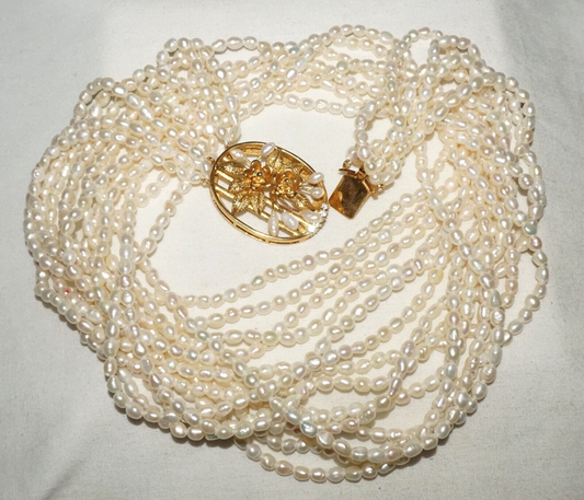 Vtg. 7x Strand Mini Baroque Pearl Necklace w. Gold Plated Floral Clasp (GoB) #20