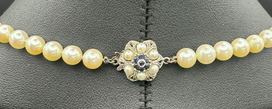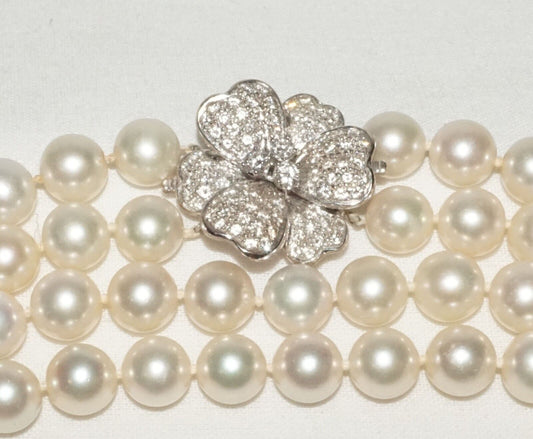 Vtg. Double Strand Pearl Necklace w. 14k W. Gold 93x Diamond Flower Clasp (LeD)