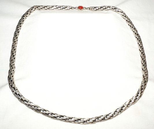 Vintage Tubular Silver Link Necklace w Bezel set Turquoise & Coral Pendant (PaS)
