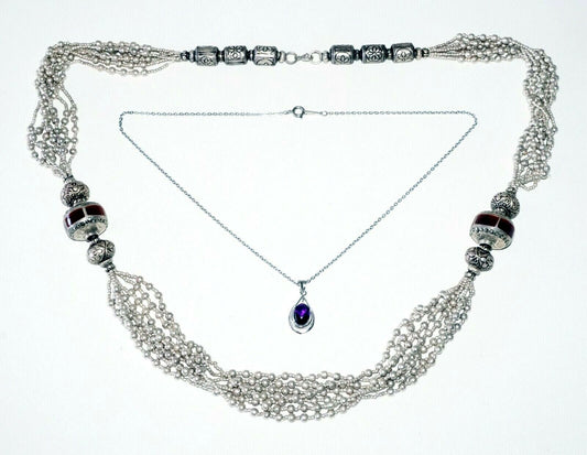 Vintage Sterling Silver Tribal Bead Necklace + Amethyst Pendant (SaR)#194