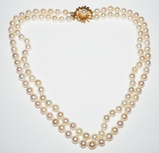 Vtg Chinese Double Strand Pearl Necklace w. Yellow Gold Flower Clasp (NaD)#17b
