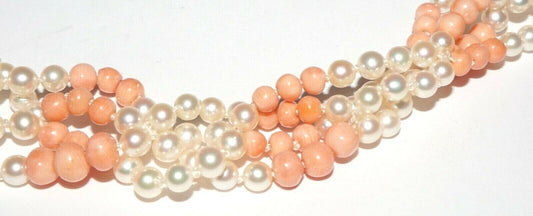 Vtg. 14K Y. Gold 4x Strand Mini Pearl & Pink Coral Bead Checker Necklace (PaS)