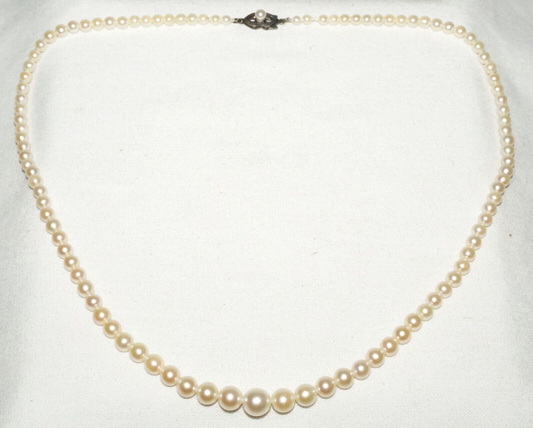 Vintage Graduated Pearl Necklace 23" w. 14k White Gold Filigree Clasp (KoS) L15