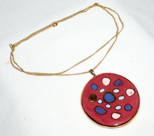 Vintage Gold Plated Necklace w. Pottery Disk Pendant in Multicolor Enamels (---)