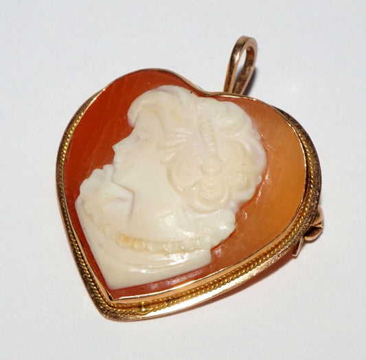 Vintage Italy 14k Yellow Gold Heart Pendant Shell Cameo Beautiful Woman (LeL)