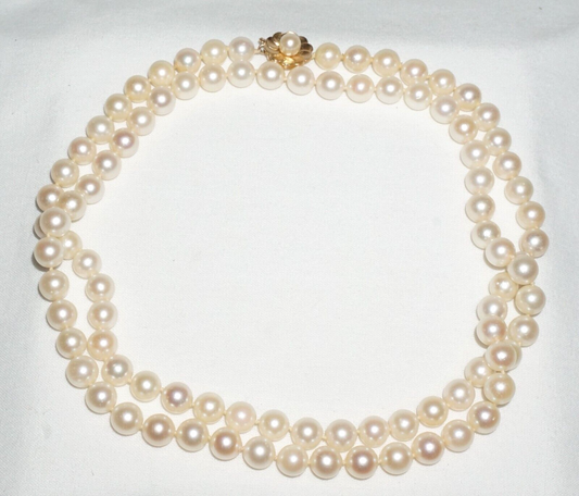 Vintage Single Strand Pearl Necklace 31" w 14k Yellow Gold Flower Clasp (BiB)