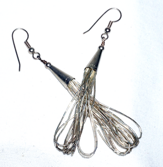 Vintage Unmarked Silver Alloy Dangle Earrings w. Tubular Bead Strands (---)