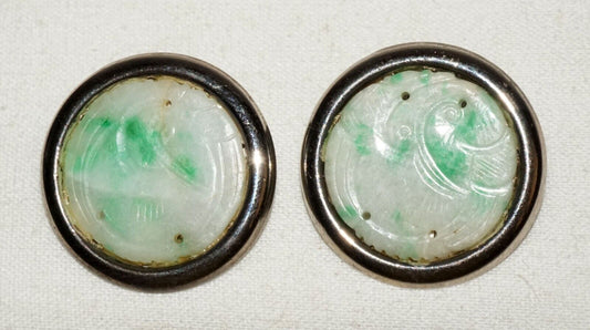 Vtg Sterling Silver White & Apple Green Jadeite Jade Button Ear Clips (LeS)L24