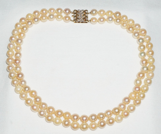Vintage Double Strand Pearl Necklace 14k Y. Gold Clasp w. 28x Diamonds (BiB)