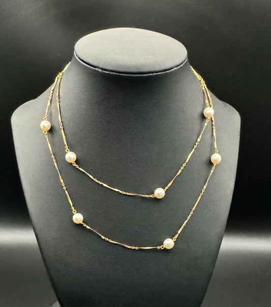 18k Yellow Gold & Bar & Bead Pearl Necklace 31" w Spring Ring Clasp (MeK)